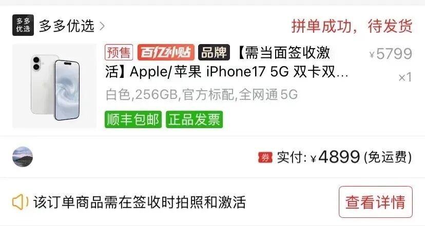 拼多多还有额外优惠,V3 等级用户可以使用 800 百亿补贴积分兑换 100 元优惠券,部分信用卡分期还能再减 100 元,叠加后 iPhone 17 最低到手价 4899 元起,创历史新低。