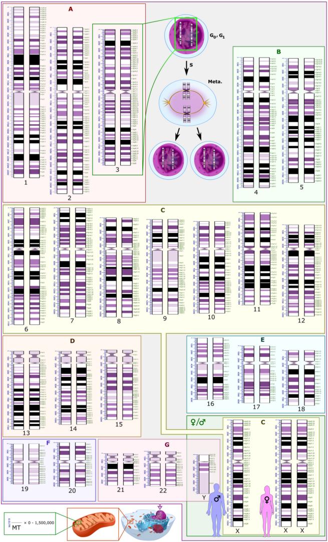 人类染色体的示意核型图,展示了基于G显带技术的人类基因组概览