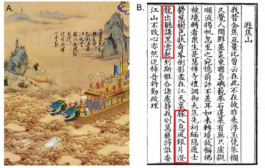 本图展示了乾隆的诗作与南巡如何为长江江豚提供了记载。(A)乾隆皇帝沿长江巡游的示意图;(B)提及长江江豚的乾隆诗作中文原文