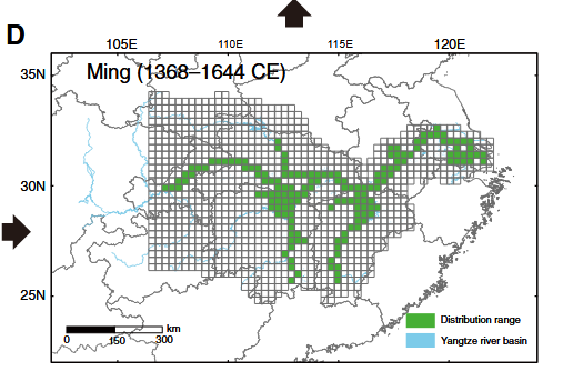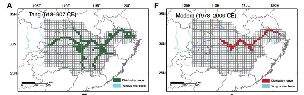 层层筛选后,724首可靠的“江豚诗”浮出水面。其中50%(362首)有具体的地理位置,78%(281首)指向长江干流,14%(51首)见于支流,8%(31首)落于湖泊(参考文献)。这些诗句如同一枚枚时空邮票,为科研提供了重建历史分布的关键线索。团队将长江流域划分为1056个30×30公里的网格(以应对千年地貌变迁的复杂),通过空间建模得出结论:江豚分布范围从唐朝的169个网格锐减至现代的59个,1400年间收缩了65%。诗行里的零星记录,被科学拼贴成一幅清晰的生态变迁图。