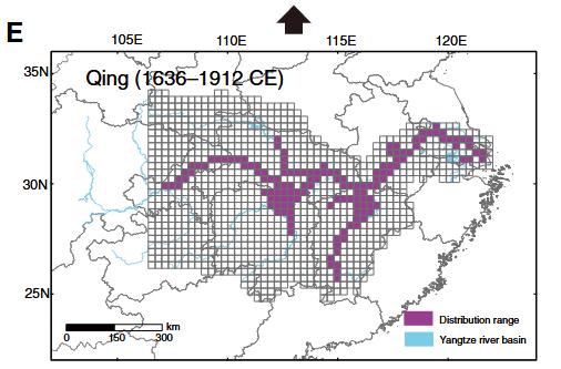 长江江豚最小潜在分布范围在D明代、E清代的空间分布