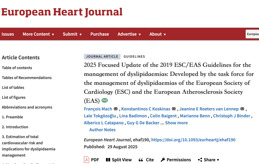 ESC/EAS Scientific Document Group , 2025 Focused Update of the 2019 ESC/EAS Guidelines for the management of dyslipidaemias: Developed by the task force for the management of dyslipidaemias of the European Society of Cardiology (ESC) and the European Atherosclerosis Society (EAS), European Heart Journal, 2025.