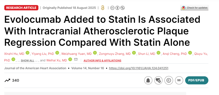 北京协和医院团队近期在JAHA发表的研究,首次系统评估了他汀联合依洛尤单抗对颅内动脉斑块的影响。