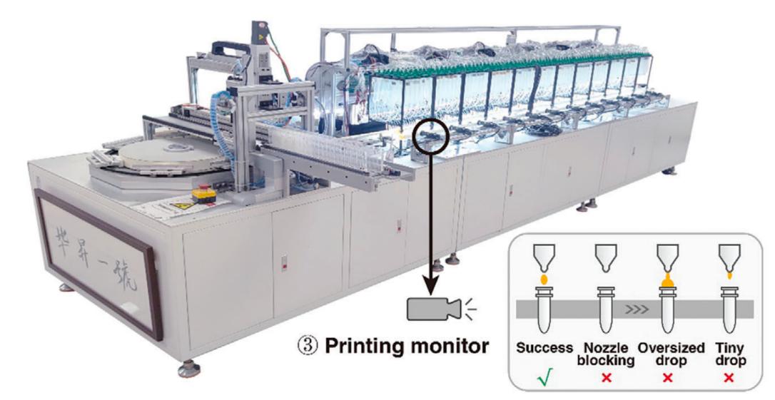 为了将DNA活字这一理念真正变成现实,实现DNA存储的自动化,研究人员设计并搭建了DNA活字喷墨打印机——毕昇一号。这个系统结合了DNA活字与现代喷墨打印技术,装配有多个DNA墨盒,并内置摄像头和图像分析软件,用于实时检测喷墨过程中的故障,从而保证较高的成功率。