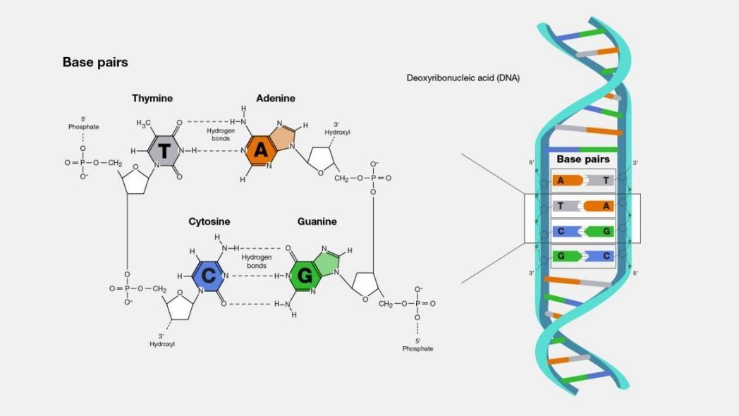 DNA,学名脱氧核糖核酸,是生命体中用于储存遗传信息的分子。它的结构类似一条长链,其中包含四种碱基:A(腺嘌呤)、G(鸟嘌呤)、C(胞嘧啶)和T(胸腺嘧啶)。这些碱基通过特定的方式配对排列,记录着生命体从外貌到功能的全部遗传信息。下图展示了这四种碱基的配对方式:A总是和T配对,C总是和G配对,它们通过氢键连接,构成了DNA的基本单元。
