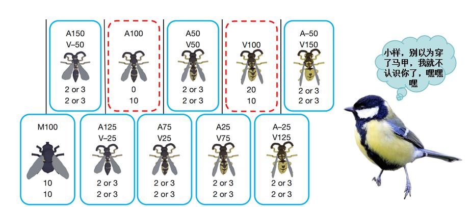 为了验证这一假说是否正确,研究团队引入了群居的常见黄蜂和独居蜂两类黄蜂模型,对比只有一种“模特”(群居黄蜂)和有两种“模特”(群居黄蜂+独居蜂)的场景下,鸟儿对“中间型”(50%像群居蜂+50%像独居蜂)的态度。