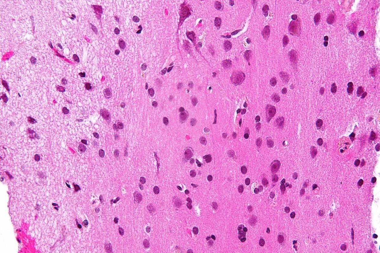 显微照相下的白质(图的左边,浅粉红色部分)
