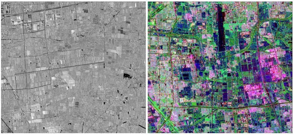 图3 单极化、全极化图像示意(高分三号)。左:3m单极化;右:8m全极化。
