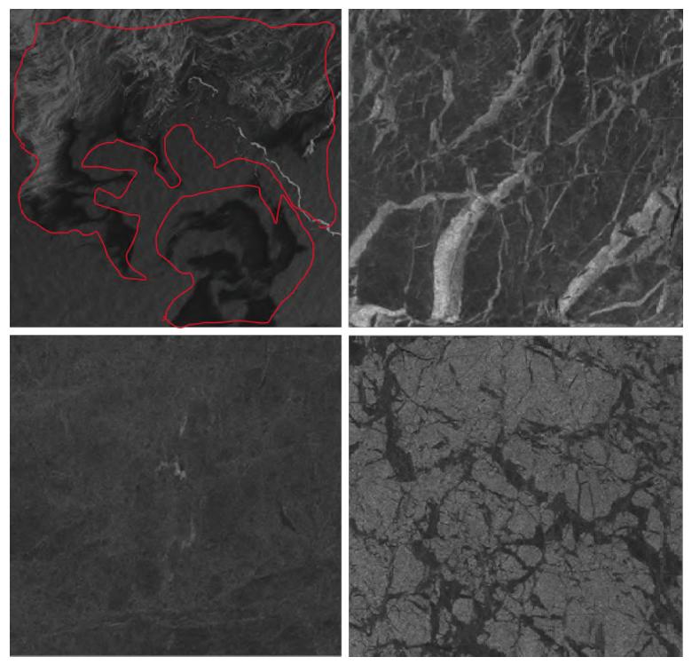 图5 SAR图像上四种冰类型:左上为冰水边界附近的新冰区域(红色勾出),右上为初期冰,左下图为一年冰,右下为多年冰。