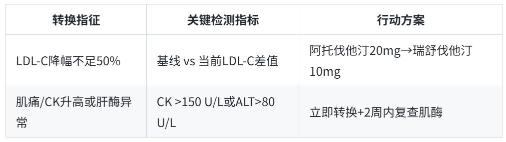 划重点:出现肌痛伴CK升高或肝酶持续异常时,转换瑞舒伐他汀不仅是缓解症状,更是预防横纹肌溶解的关键干预。