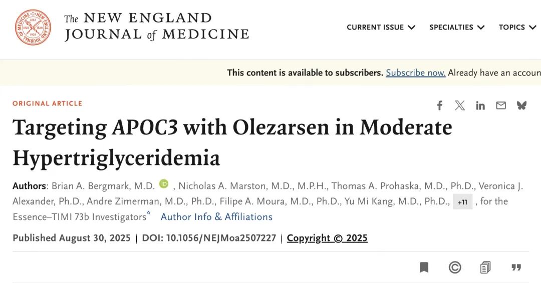 1:Bergmark BA, et al. Targeting APOC3 with Olezarsen in Moderate Hypertriglyceridemia. N Engl J Med. 2025. DOI: 10.1056/NEJMoa2507227