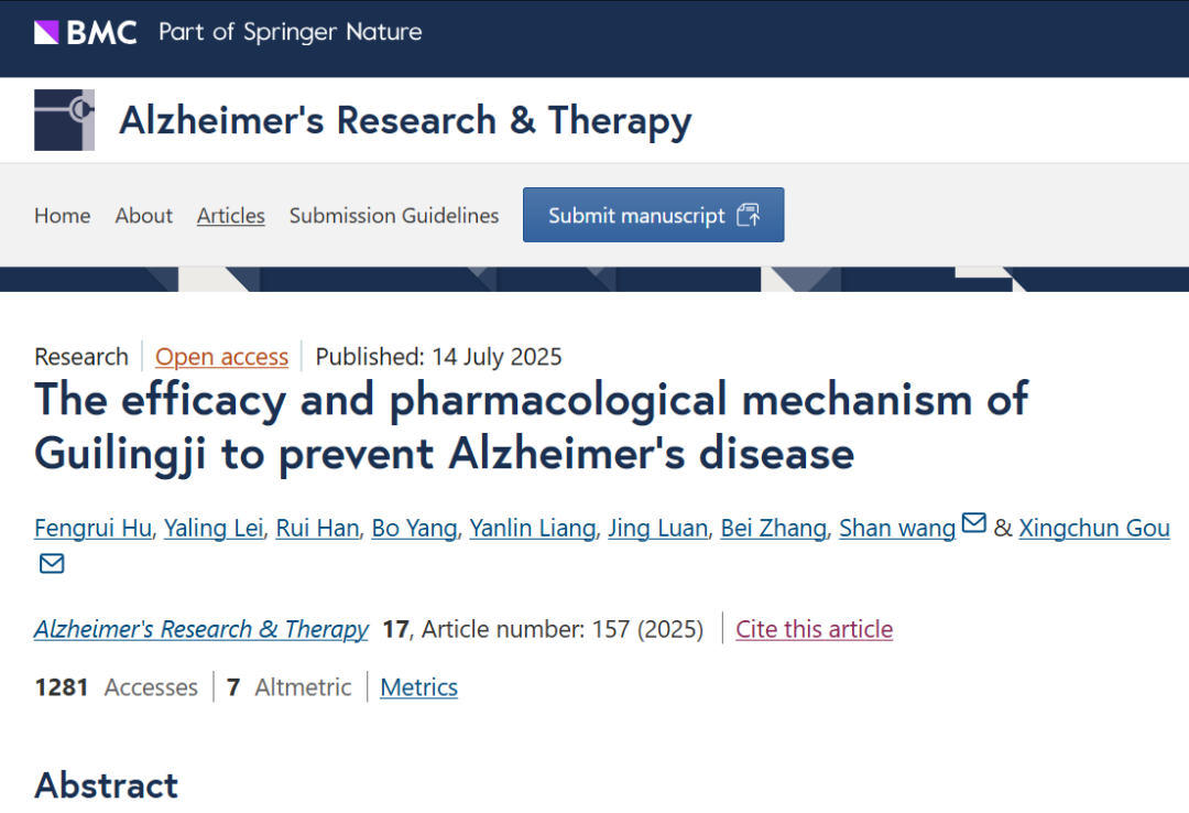 Hu, F., Lei, Y., Han, R. et al. The efficacy and pharmacological mechanism of Guilingji to prevent Alzheimer’s disease. Alz Res Therapy 17, 157 (2025).