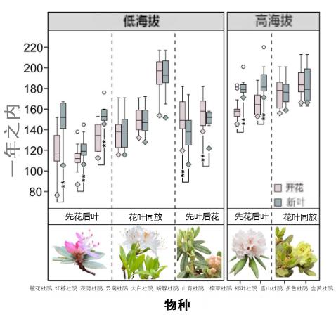 高山上的杜鹃像一个执着的守约人,不断调整自己的步调,以适应环境。为了追上时间的脚步,它们演化出了三种“履约策略”(花-叶序列):先花后叶(FF),花叶同放(FL),先叶后花(LF)(参考文献)。看似是简单的先后顺序,实则会导致截然不同的命运(参考文献)。