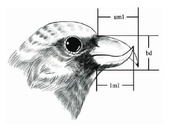 左图为红交嘴雀喙型及测量指标示意图,uml为上喙长,lml为下喙长,bd为喙深图;右图为红交嘴雀取食松果示意图。