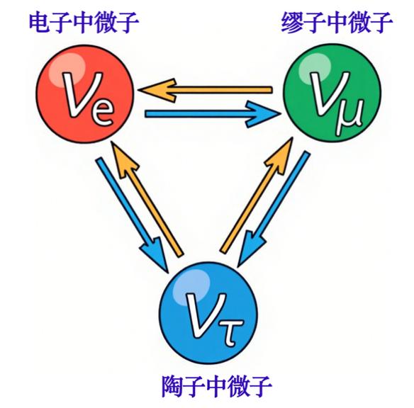 中微子有三种“味”——电子中微子、μ子中微子和τ子中微子。这里的“味”并不是指真正的味道,我们可以简单将其理解为物理学家给不同类型中微子起的名字。神奇的是,一个电子中微子在飞行过程中可能突然“变身”成μ子中微子,这种变化被称为中微子振荡,是量子力学世界特有的奇妙现象。
