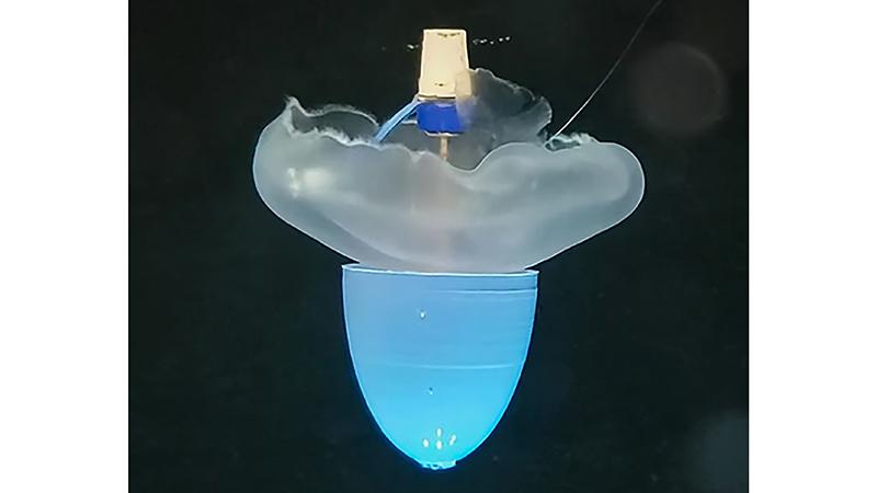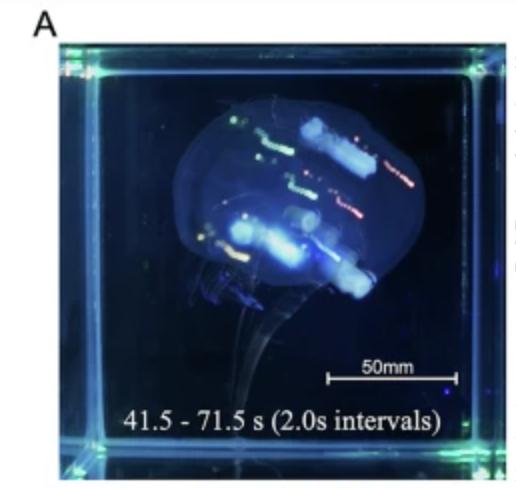 除此之外,一个来自美国加州理工学院(Caltech)的研究团队,他们在2023年也对海月水母进行了赛博改造。