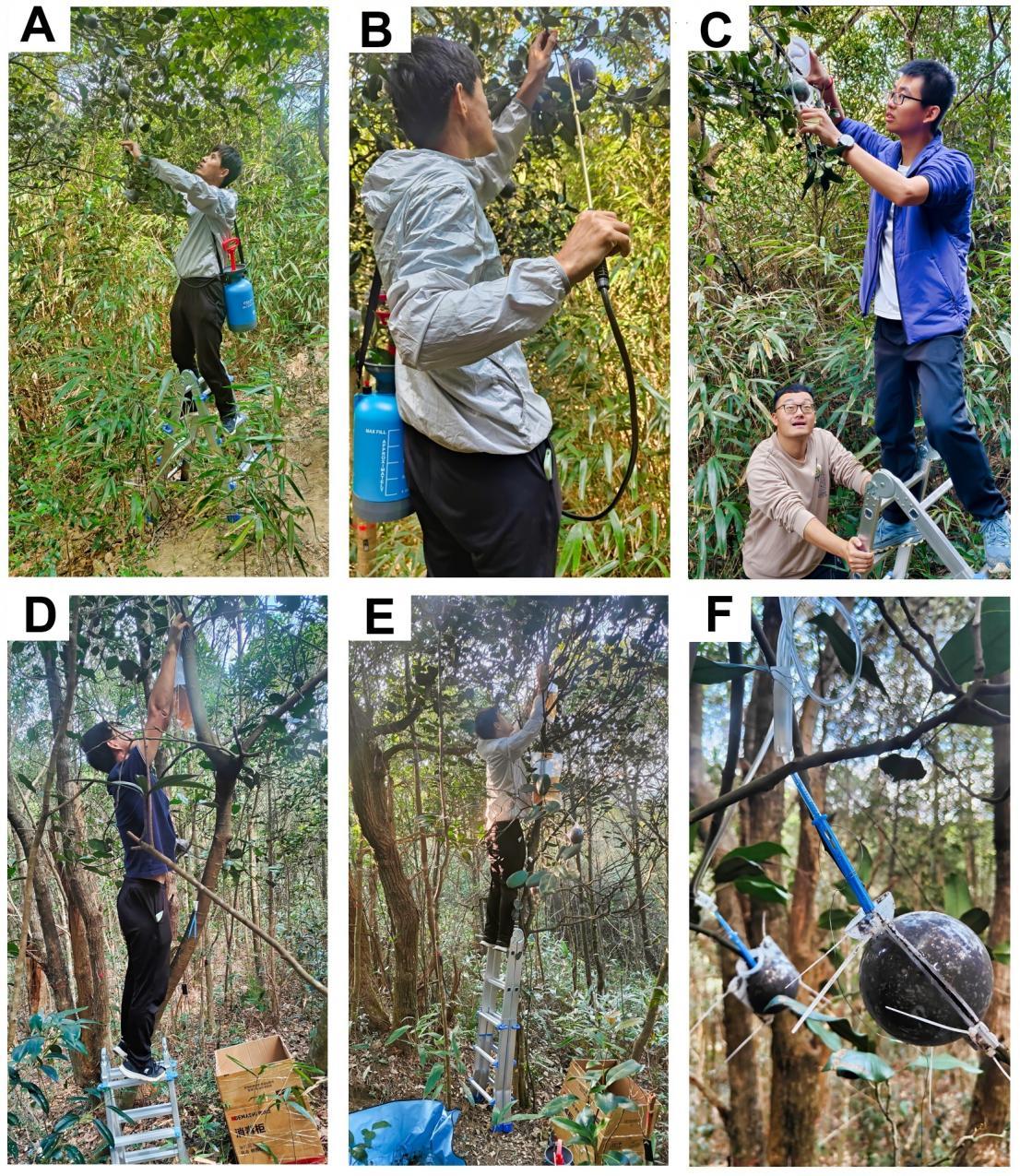 繁育期间,正值广东遭遇异常干旱(杜辉等 2025)。为保证高压繁殖的枝条有充足的水分生根,团队成员每周都要进山,亲自浇水,并定期施肥。直至2025年3月底雨季来临,才减少人工浇水的频次。在繁育期间,考虑到人工浇水成本高昂,团队成员还尝试安装了自动滴灌系统。但由于装置本身的限制、野外复杂的环境及其供水条件制约,这个系统还不够完善。团队计划在今后的工作中研发新的全自动化系统,这会使濒危物种的野外繁育工作更加高效、智能。