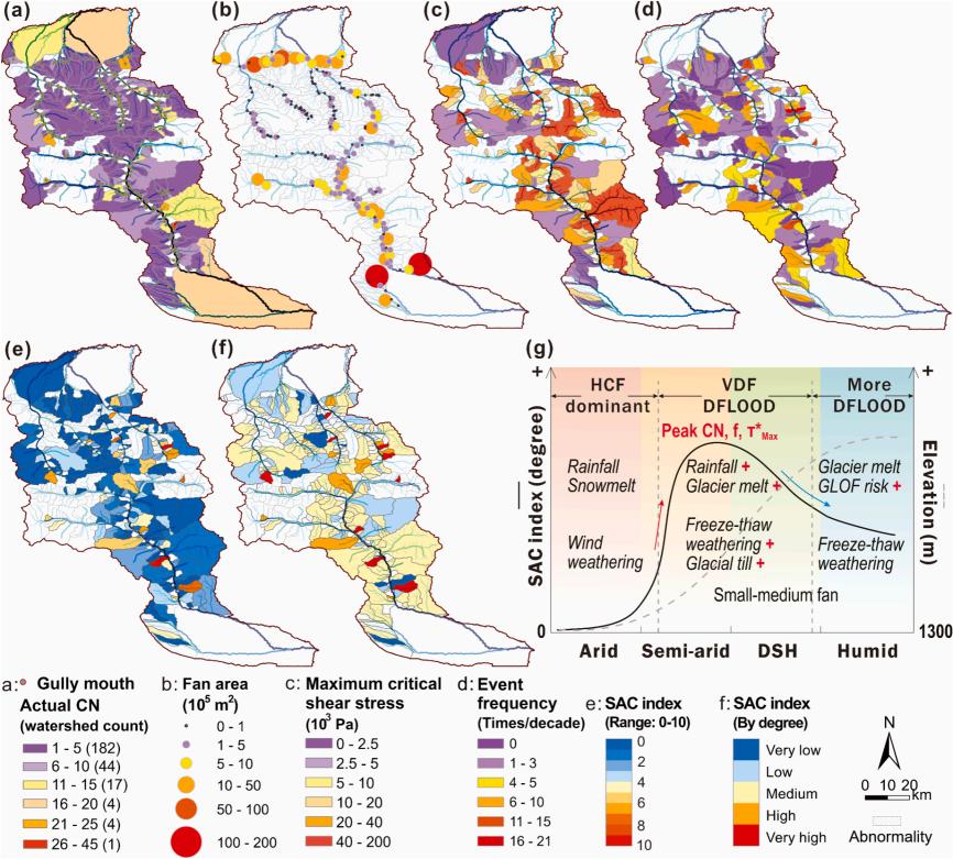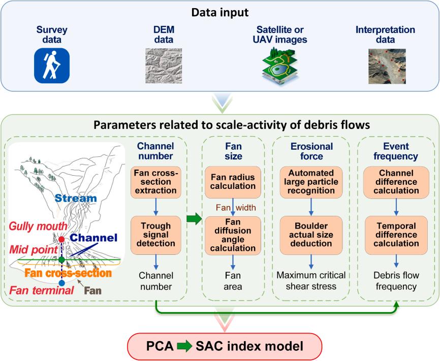 在此基础上,我们团队构建了“规模-活动性复合指数(SAC)”,用于量化泥石流的活动程度。SAC指数综合考虑了泥石流的规模和频率两个方面,通过主成分分析方法将多个泥石流活动性关键参数(包括沟道数量、扇体大小、最大临界剪切应力和事件频率等)集成到一个指数中,能够全面反映泥石流的活动特征和潜在危害。