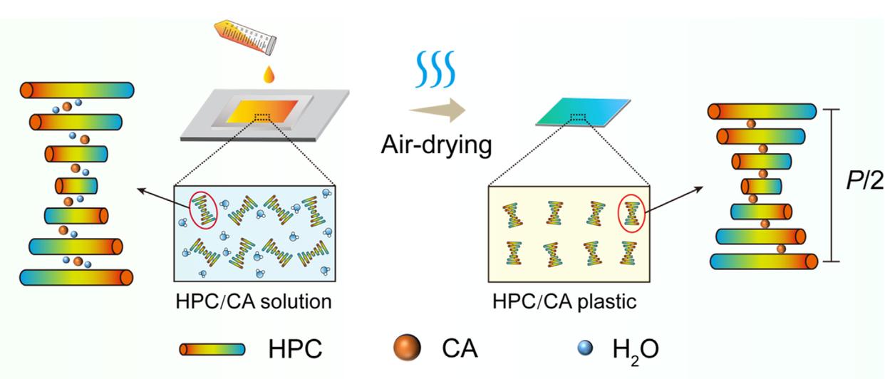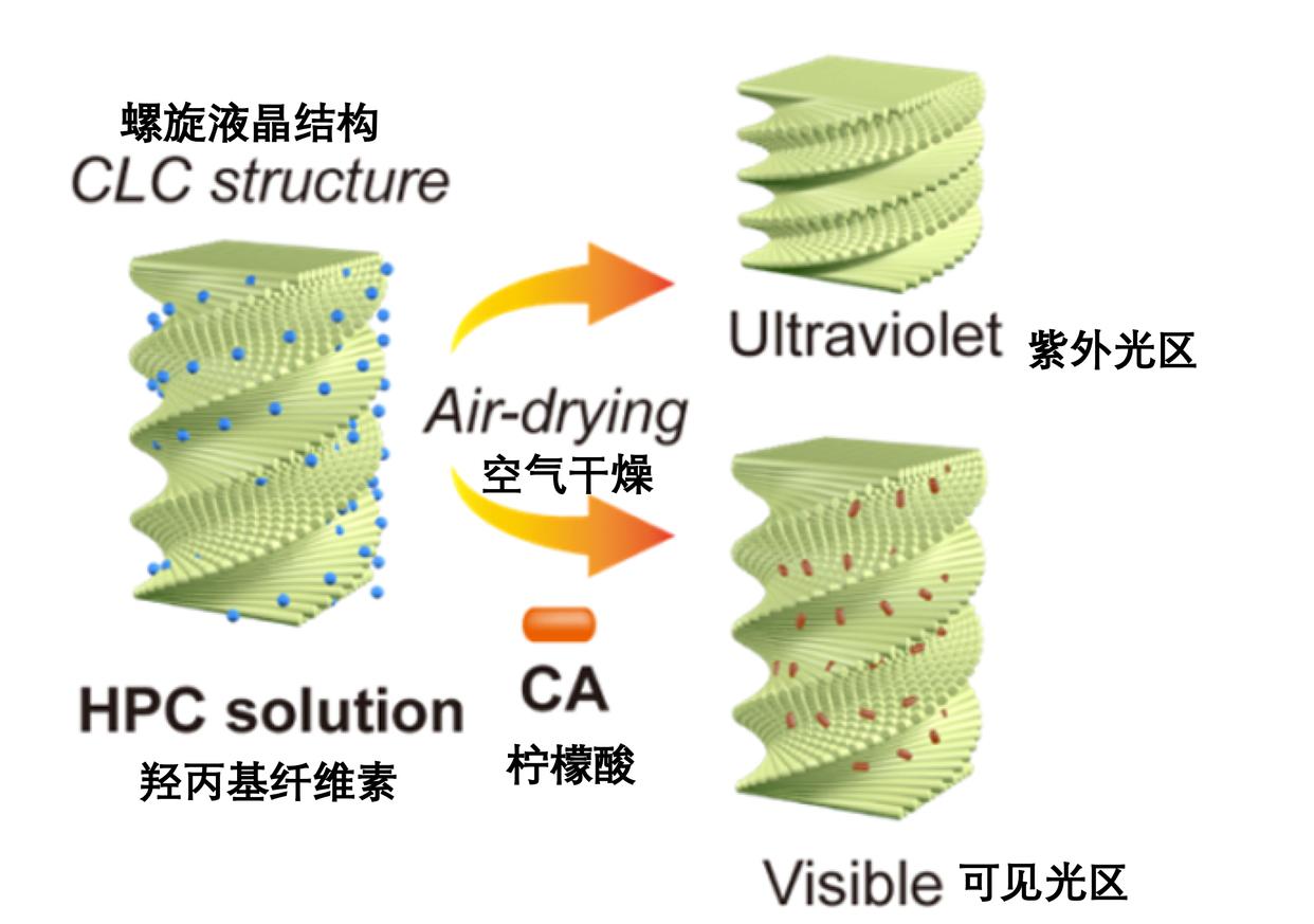 他们以羟丙基纤维素(HPC)为基体,引入了柠檬酸(CA)。这种物质可食用、可生物降解、且能提供多重氢键,能够在干燥过程中“支撑并锁定”手性液晶的螺旋节距,使颜色在固态下依然明亮,并且可随配方线性调谐,覆盖整个可见光谱。