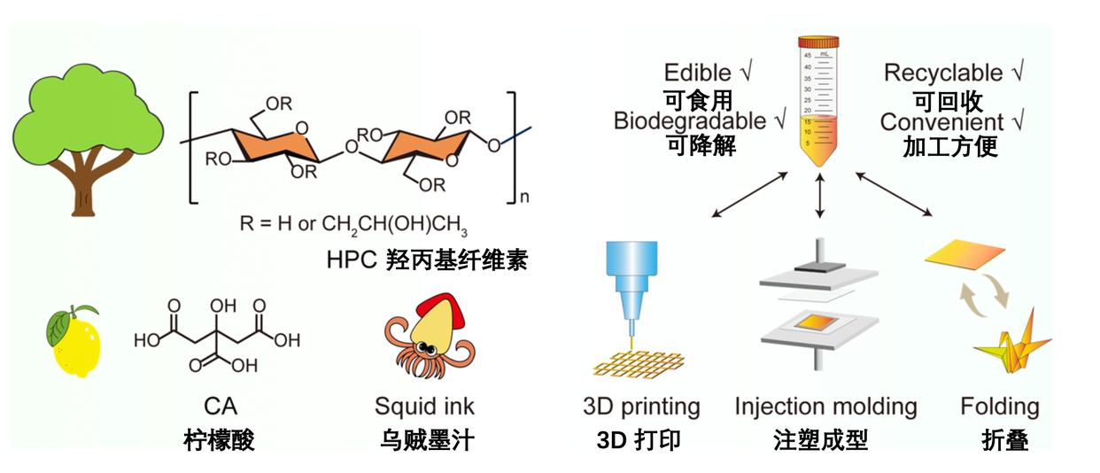 其次,在加工工艺上,这种材料与现有制造方式高度兼容,既可以像墨水一样进行3D打印,也能通过注塑成型得到复杂三维结构,甚至还能在高湿环境下进行折纸式成型,干燥后固定形态。而配方中的柠檬酸含量可以直接决定颜色,类似于一个天然调色盘,同一批原料就能做出彩虹般的成品。