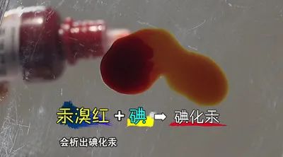 红药水的主要成分是汞溴红,碘酒、碘伏的主要成分是碘,碘和汞溴红混合在一起会析出碘化高汞。