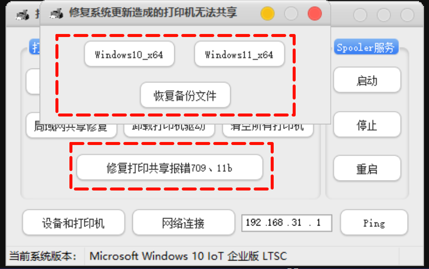 支持修复各类打印共享错误代码(如709、11B等),并能一键恢复系统备份文件。
