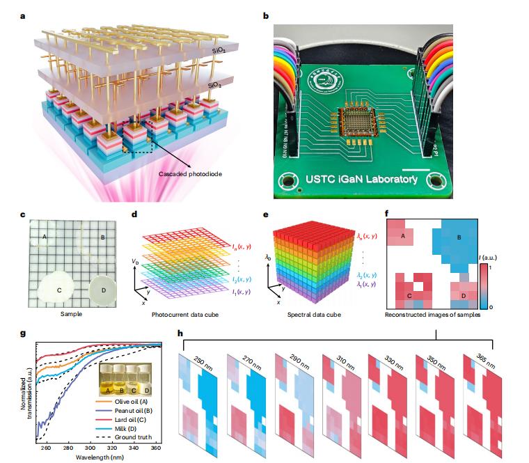 这项技术的创新之处在于,它不依赖传统的几何分光与机械扫描,而是基于氮化镓(GaN)基垂直级联n-p-n光电二极管阵列,结合深度神经网络算法,实现了高精度光谱探测与高分辨率多光谱成像。