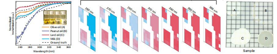 为验证成像仪芯片的性能,iGaN团队利用其对橄榄油(A)、花生油(B)、动物油(C)和牛奶(D)四种有机物液滴进行了光谱成像,并通过其在紫外波段的吸收特性,清晰呈现出四种材料的空间分布及透射特性,测试结果与商用光谱仪高度一致,空间分辨率高达300μm×300μm,进一步验证了光谱成像芯片的可靠性。