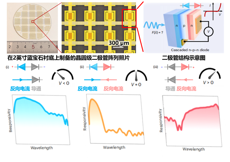 在零偏压状态下(V=0),当入射光为波长较短时,电子-空穴对主要由底部二极管产生;当入射光波长较长时,底部与顶部的二极管均能产生电子-空穴对,但由于两个二极管方向相反,两组电子-空穴对会相互抵消,最终器件仅保留对短波长光的窄带响应。