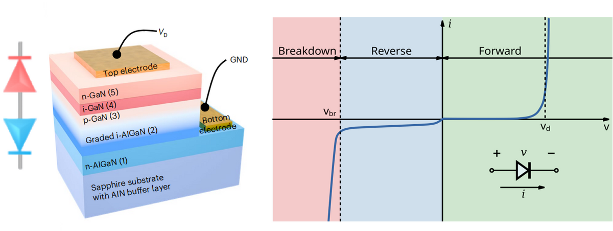 垂直级联n-p-n光电二极管结构示意图(左)及二极管的电流-电压特性曲线(右)