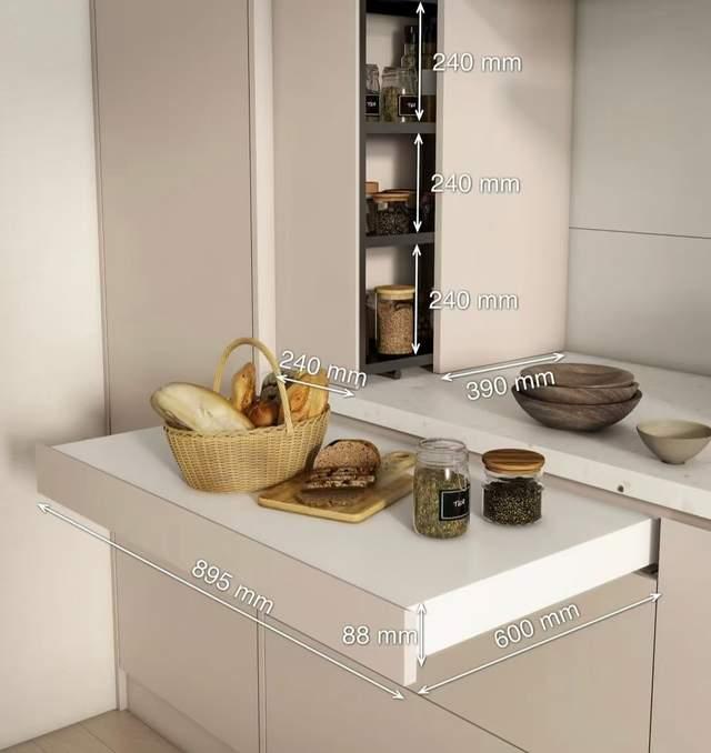 厨房面积就那么大,橱柜就那么长,就只能从其他地方下手,比如做个隐藏式抽拉操作台。