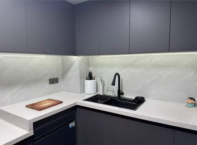 现在大家在定制橱柜的时候都不要台面后挡水,不好看又不好清理,但是前挡水真的很有必要。