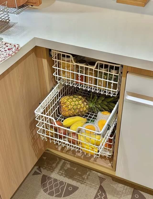 有些人家里是直接放在厨房地上,不干净也不美观。其实可以在做橱柜设计时预留一个果蔬收纳区,只需要占用一扇柜门的位置即可。