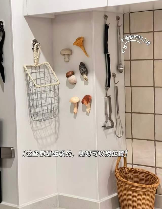 珐琅板还可以磁吸各种不锈钢餐具,墙面空间也就利用起来了,还不用打孔。