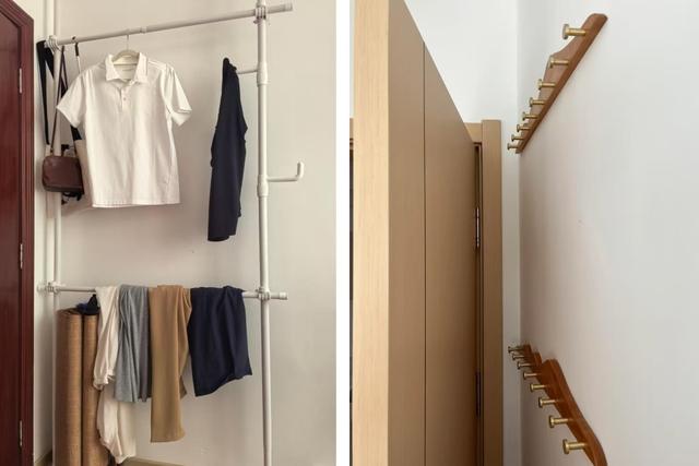 如果玄关空间小,又想挂在玄关的话,也可以直接在鞋柜内部预留出一部分空间做次净衣区,或者直接在墙上安装几个挂钩挂衣服。
