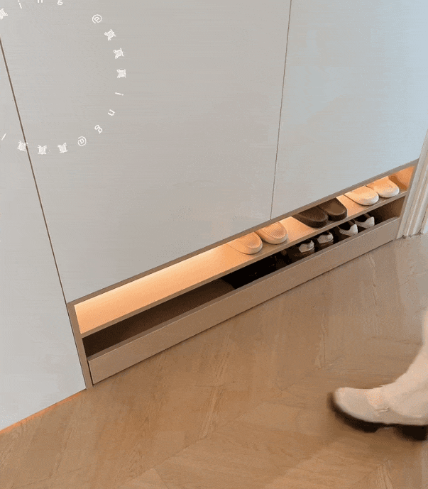 不如给鞋柜预留两层镂空,做“踢脚抽+层板”的设计。