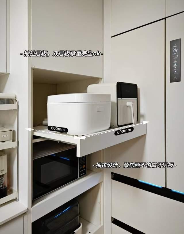 每一个层板上都可以放两样电器,用的时候拉出来,也额不用担心蒸汽会熏坏柜板,不用的时候推进去不容易积灰。