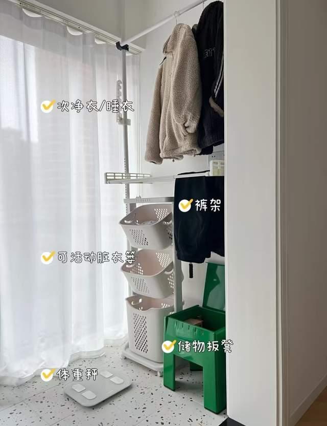 除了定制衣柜外,其实也可以直接安装简单的置物架,搭配横杆和脏衣篓,一个好用的次净衣区就完成了。