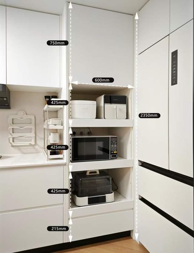 在橱柜里预留出60公分宽的尺寸单独做一组高柜,最上面做柜门放不常用的物品,最下面做抽屉放小厨电耗材,中间设计成抽拉层板放小厨电。