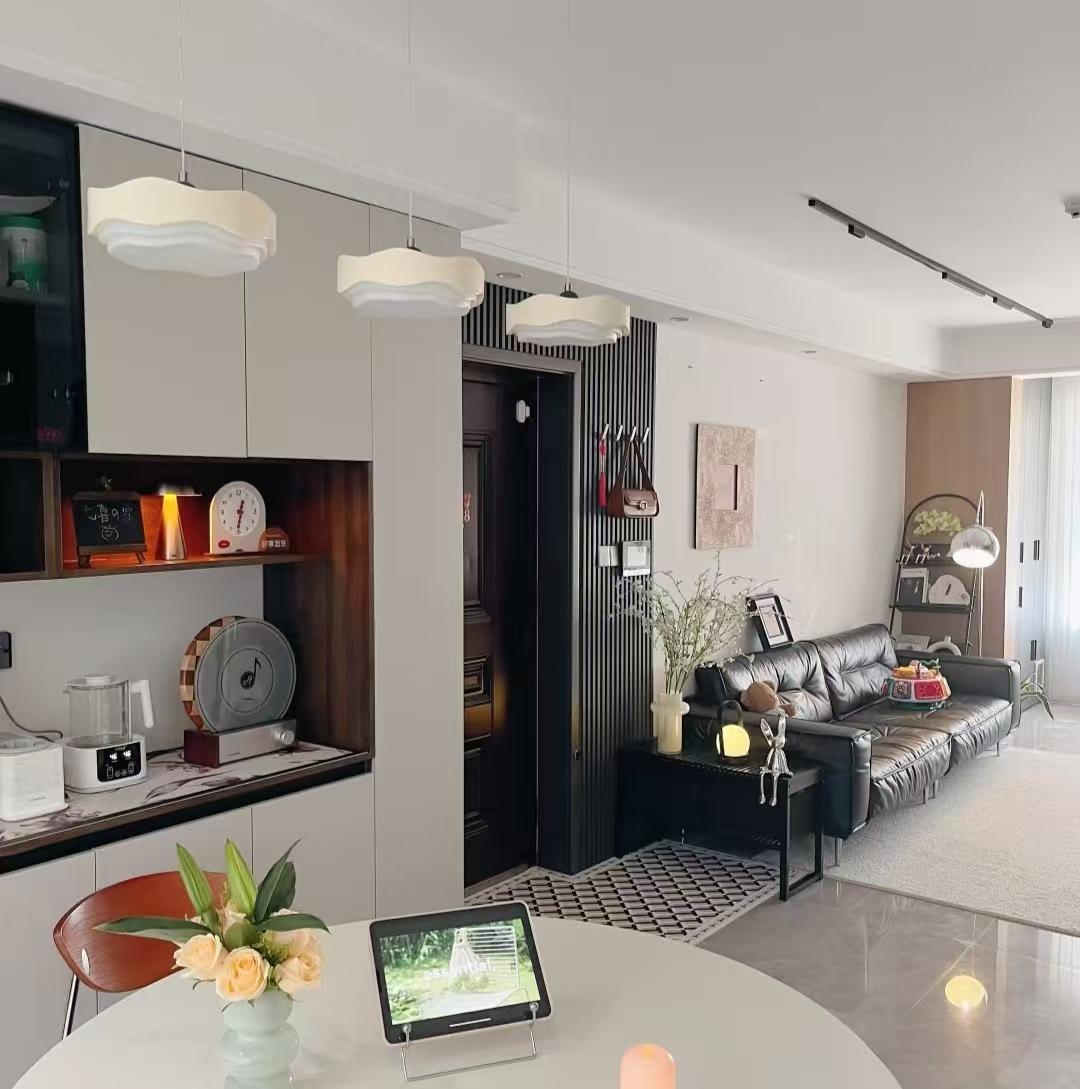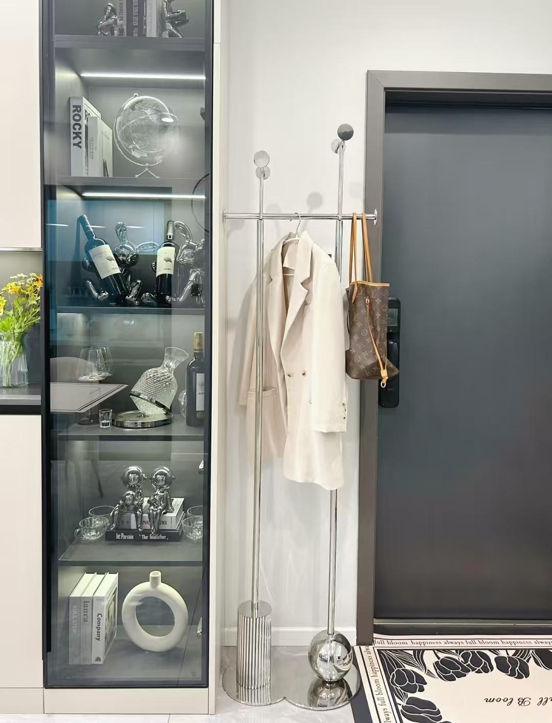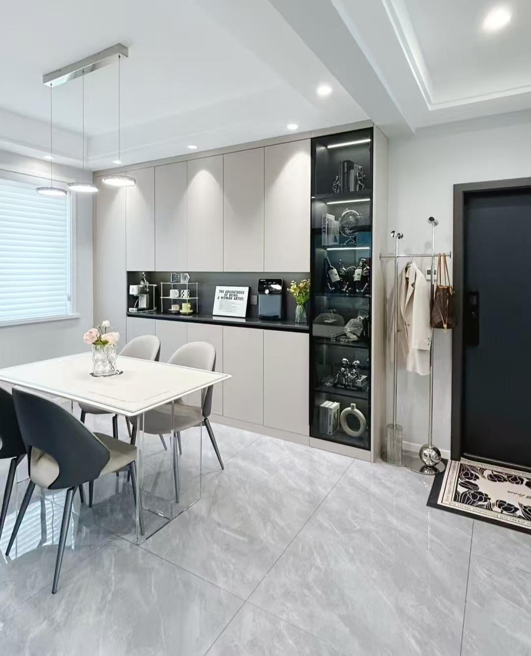 靠近餐厅的一侧墙面设计了餐边柜,为了避免一进门就有大体量柜子有压抑感,她特意把餐边柜没有设计到顶着入户门,留出部分空间刚好放个落地衣架,平常放个包、挂个外套非常好。