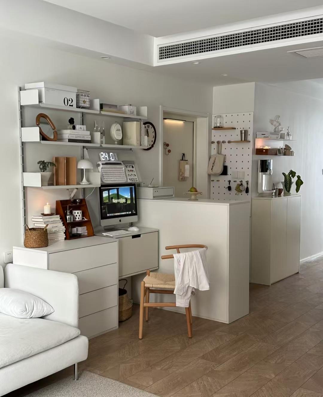在靠近客厅的一侧,网友定制了一组隔断柜,柜体+玻璃的形式,既有收纳、有隐私又不会影响采光和空间上的通透感,还多了一个可以装饰的小台面。