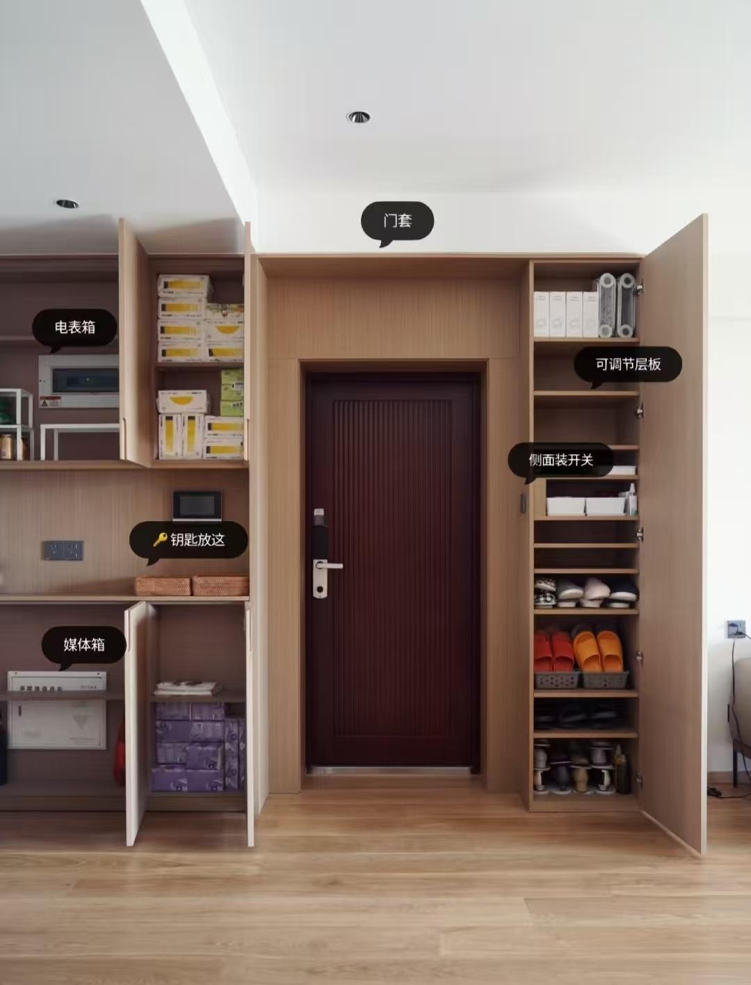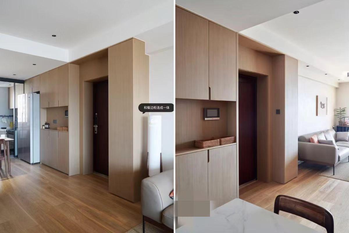 站在室内看向入户门,左侧是餐厅定制了餐边柜,右边是客厅,同样定制了一组和餐边柜同深度的收纳柜,两组柜子中间全部用柜门同款木饰面包裹住。