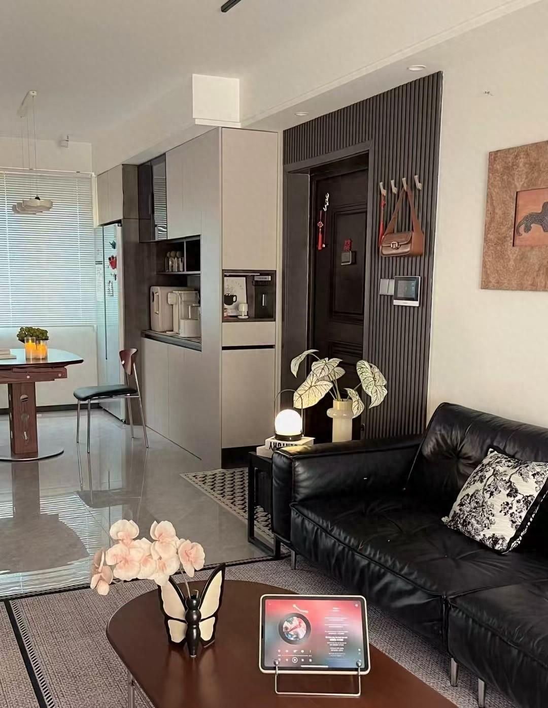 为了让入户区看起来更美观时尚,网友特意用深色格栅板做了墙面造型,同时也是沙发墙的背景造型,搭配黑色皮质沙发和黑色边凳,颜值绝对没的说。
