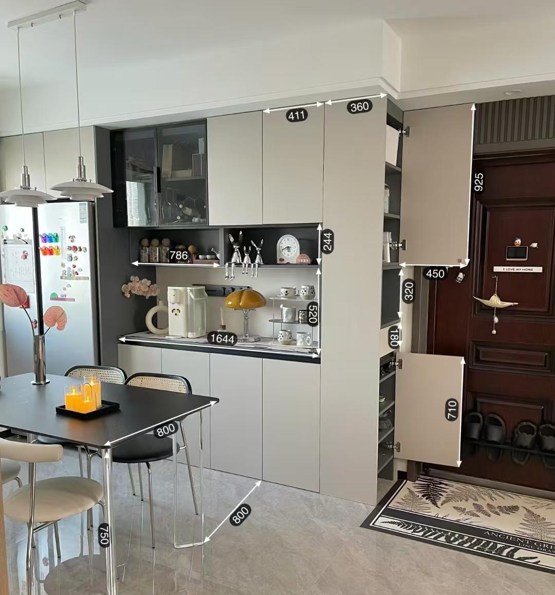 常规的餐边柜深度都是35公分,为了凑鞋柜的尺寸,网友把餐边柜设计成了45公分深,这样靠近入户门的一侧就可以设计一组宽*深为45*36公分的鞋柜。