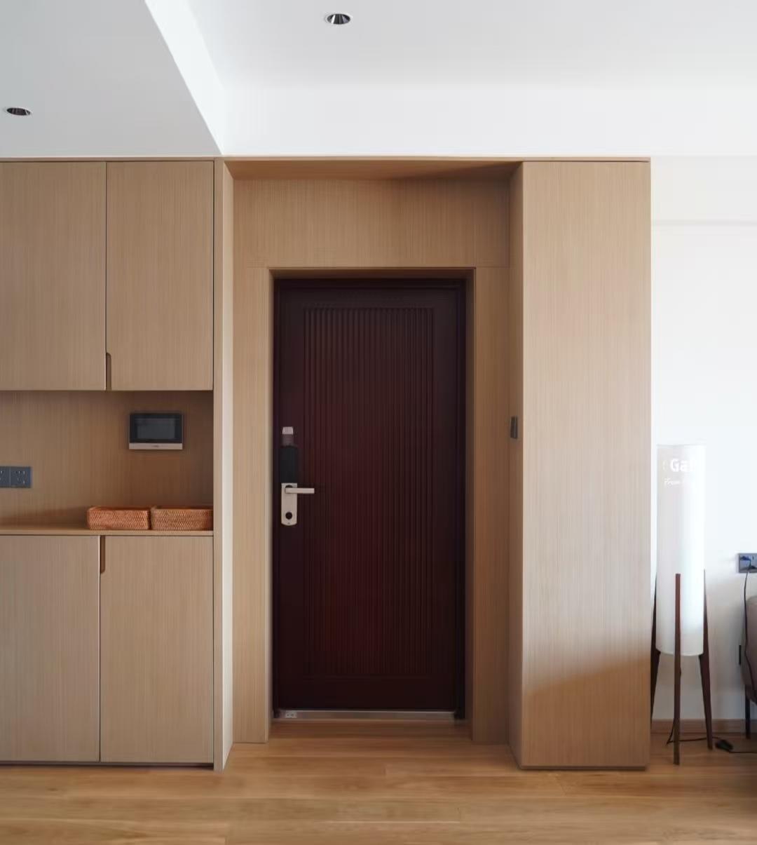 另外,入户门上方的吊顶也用同款木饰面装饰,两组柜子就这样连接成了一个整体。