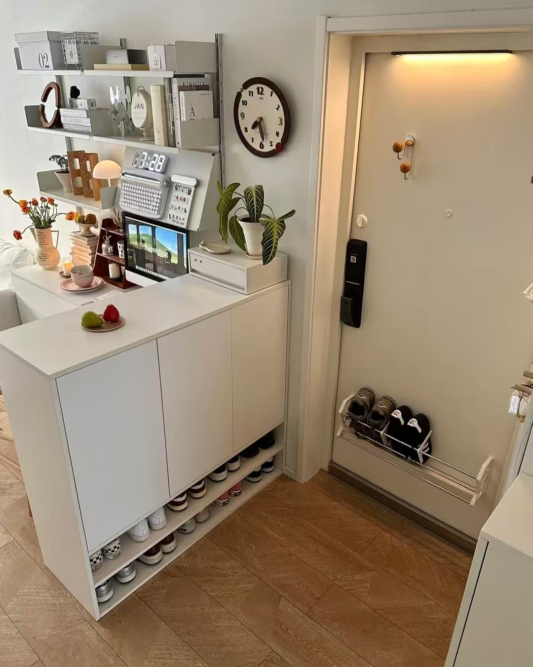 为了让入户看起来清爽美观、鞋子有地方放,网友利用餐边柜的侧面设计了一组鞋柜。