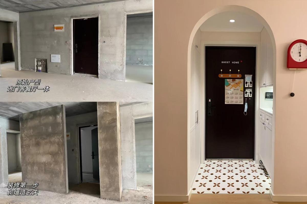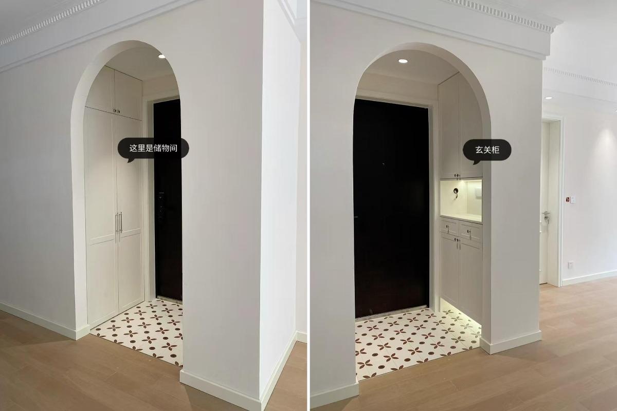 原本入户门两侧分别是客厅和餐厅,网友两边分别砌墙,一边预留玄关柜,另外一边是储藏间,与客餐厅连接的门洞设计成了弧形门洞,很有设计感。