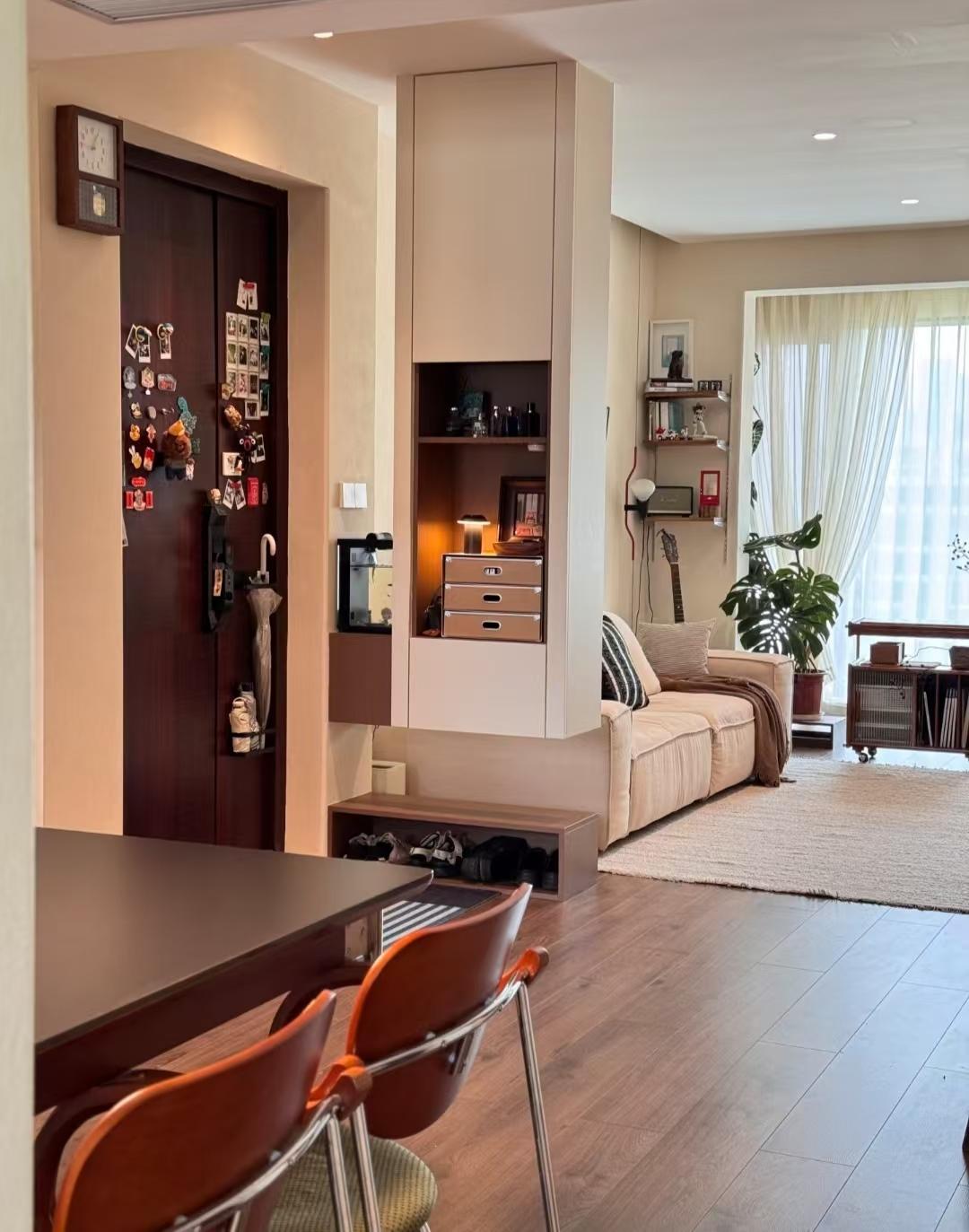 网友@Mm家进门后往餐厅都得地方是有一堵窄墙面的,往客厅那边完全就是没有任何阻挡,没有玄关的概念,所以她在入户门和客厅之间设计了一组半高隔断柜。