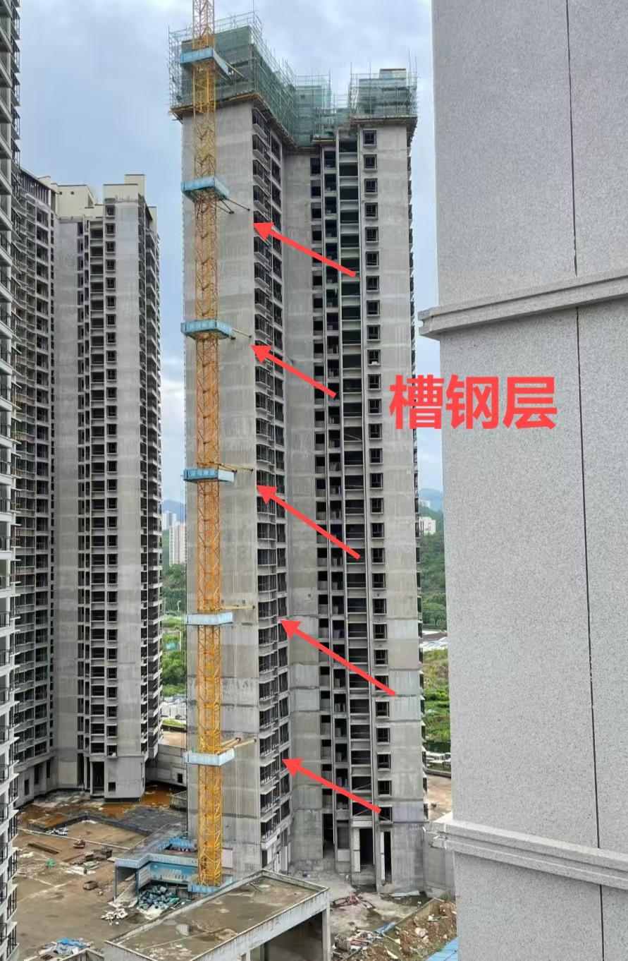 工人在建房子的时候,为了施工安全,每隔几层就会在墙面穿插一些槽钢用于固定外悬的脚手架,被穿插了槽钢的这一层就是槽钢层,买房的时候最好要避开它。