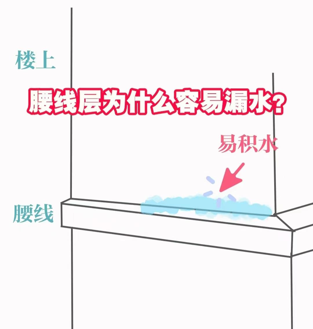 其次,腰线层有渗水的风险,因为腰线是直接挂在外墙上的,腰线上面是一个平台很容易积水,雨水一旦无法及时排掉就容易顺着墙体渗透到室内。